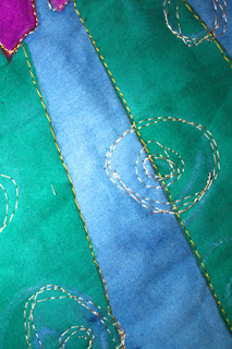 Another project we had to create was fabric ATC's using a transferred image. Most who know me will tell you how much I love ATC's, after all why would I make one a day for an entire year, right. In a weird coincidence it also required us to do an image transfer which is one of my favorite techniques to use when I art journal. So this project was right up my alley. I used white muslin that I glimmer misted with sunflower yellow and vintage pink. After it dried I cut these two butterflies out and used gel medium to do the transfer. The preferred method to do a transfer on fabric is to use a transparency, but I didn't have any so I did a direct image transfer, which makes the fabric a little stiff where the transfer was done. I then made a mini quilt sandwich with batting and another piece of muslin for the back, then took it all over to my machine and free motion stitched the scrolls and outlined the butterflies. Lastly I used a zig zag stitch around the edges. And here is how it came out.